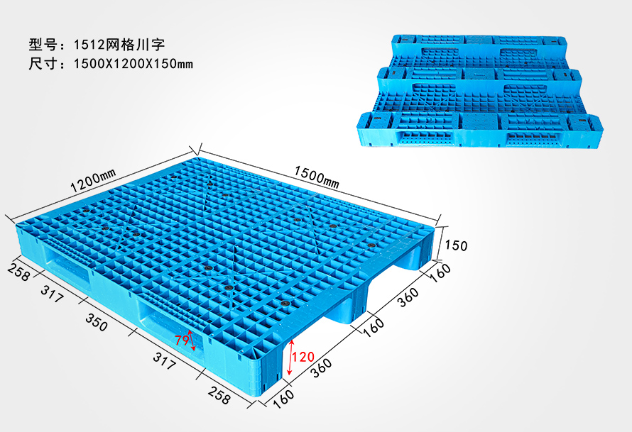 | 1512網(wǎng)格川字托盤 | 1500*1200*150 | 18.5 | 2T | 6T | 12 |